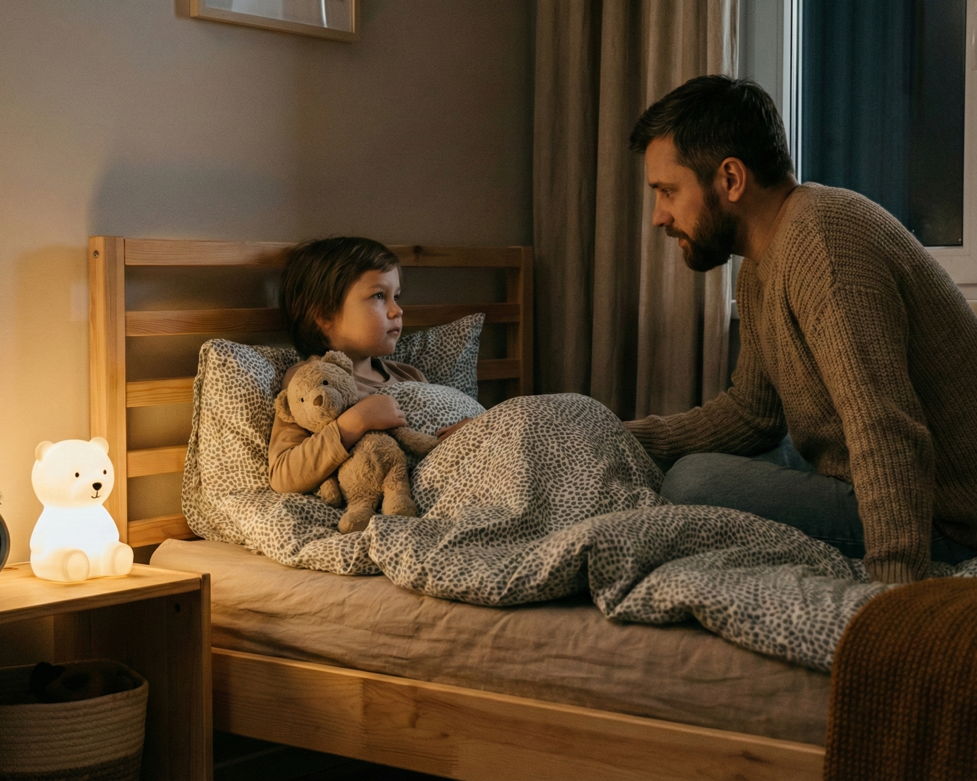 Monstres, cauchemars, impossible de dormir seul. Vous êtes épuisée. Il dort maintenant. Vous aussi. La nuit est redevenue un moment de paix.